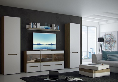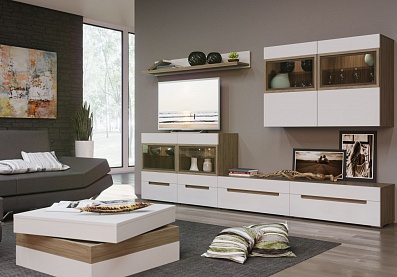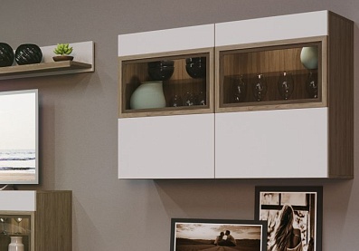- Корпус мебели выполнен в цвете «швейцарский вяз», фасады — в цвете «белый матовый»;