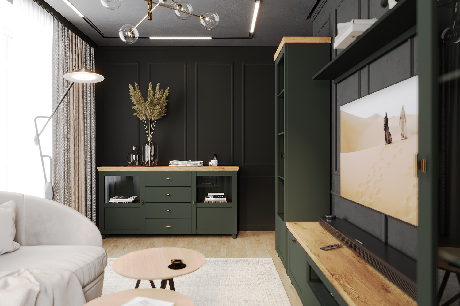 - Комод укомплектован 2 полками ЛДСП за распашными дверьми и 4 ящиками;