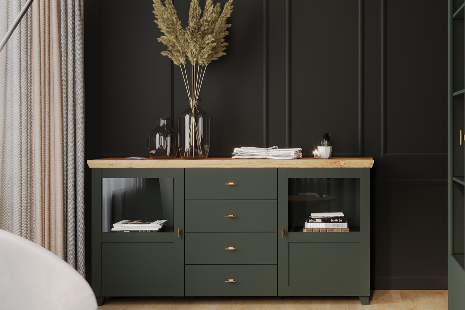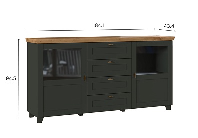 - Комод на деревянных опорах с 4-мя выдвижными ящиками и 2-мя распашными фасадами;