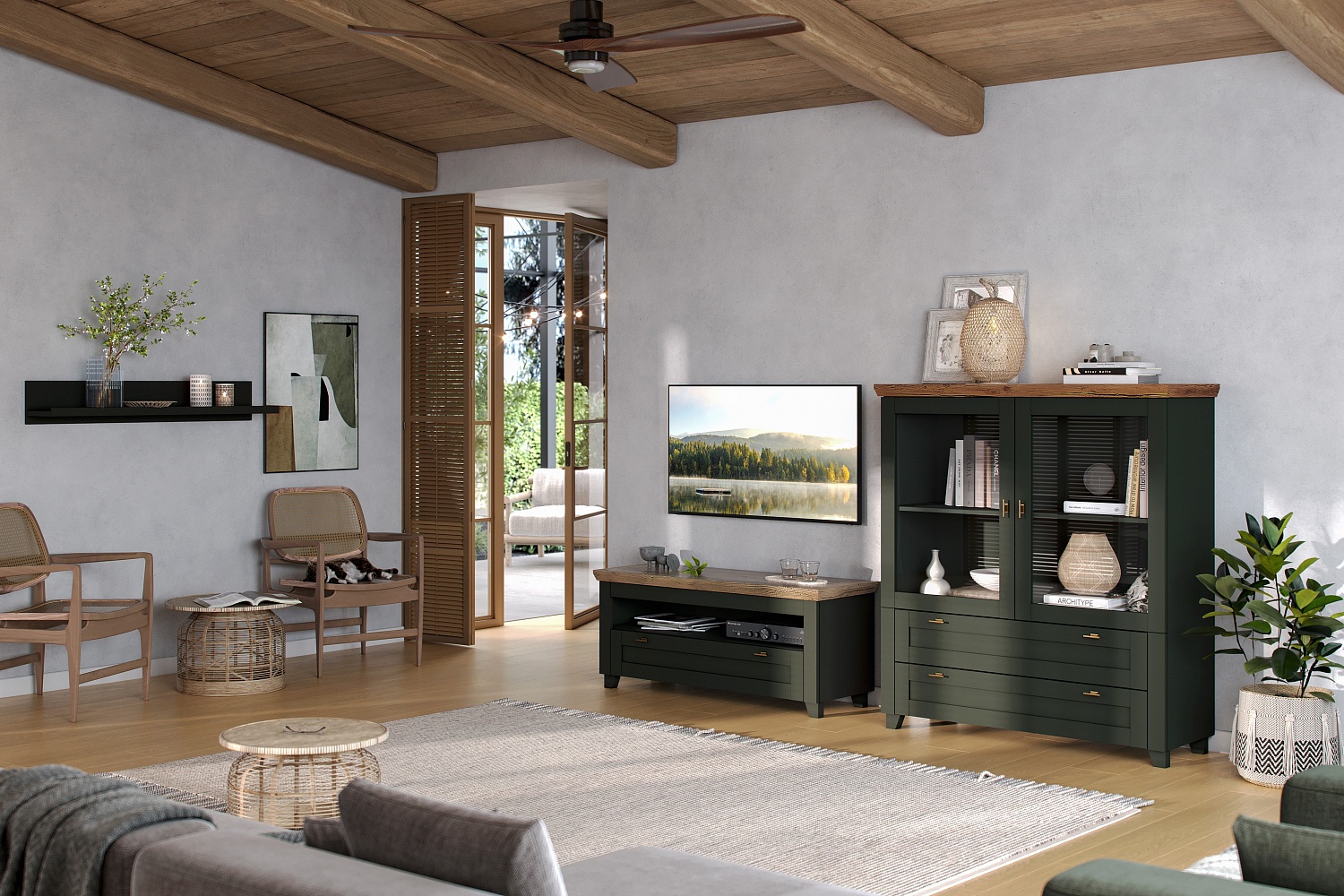 - Шкаф низкий с рамочными фасадами и двумя выдвижными ящиками;