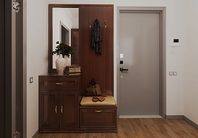 - В гостиной есть вся необходимая мебель для хранения: два напольных шкафа, два навесных шкафа, тумба с двумя выдвижными ящиками и две вместительные полки. Для самого важного всегда найдется место;